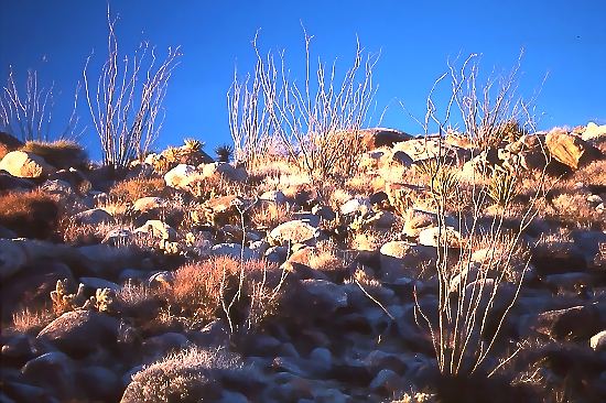 The most eye-catching plants of the desert are ocotillos and cacti. The ocotillo is a spiny shrub with photosynthesizing stems and small bright green leaves. There is no plant that I know, which looks similar. Ocotillos provide a most picturesque sight against the blue sky: