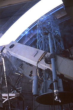 Before I went windsurfing the other day, I drove up to Mount Wilson, which is 5710 feet above sea level. At the summit of the mountain is the "Mount Wilson Observatory". Much of our understanding of the Universe came from research done at this facility. The photo below shows the "100 Inch Hooker Telescope", which was just serviced during my visit.